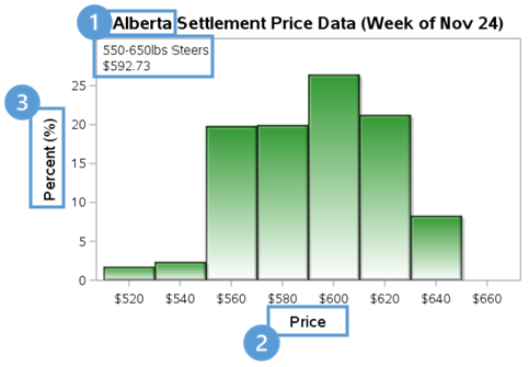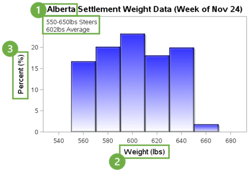 - Identify what region (Alberta or SaskMan), weight ranges (Calf or Feeder), and settlement index (cash price for the week) the graph represents